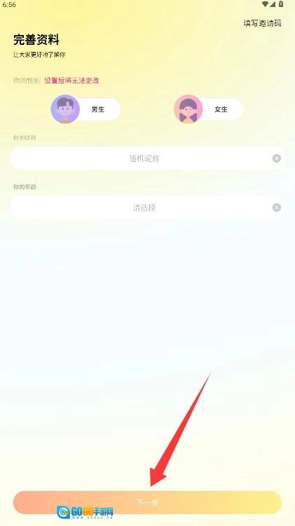 完善个人信息,选定性别、填写昵称与年龄,完成这些操作后点击“下一步”即可进入应用