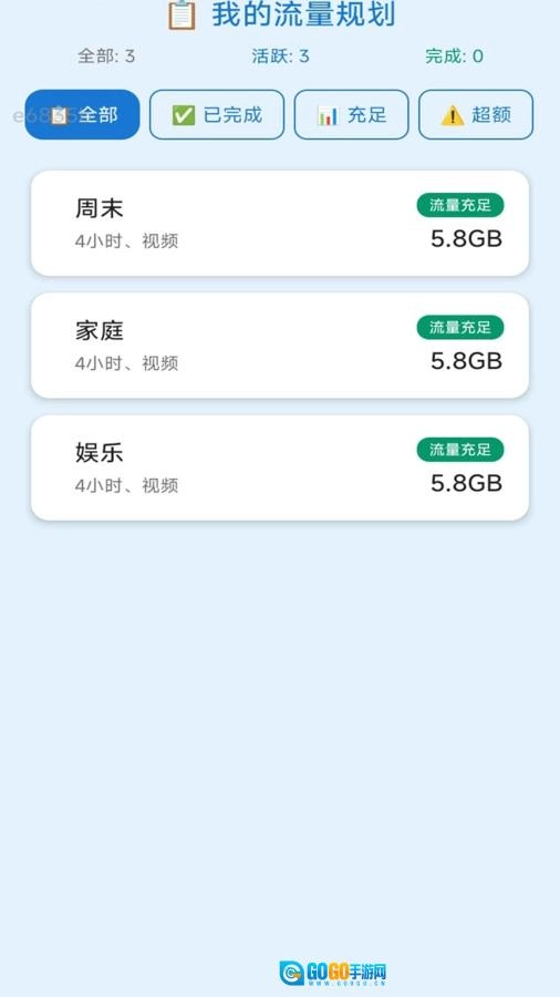 规划列表会标示流量是否充足、活跃、完成、超额等状态分类,帮助您清晰掌握每个场景的流量使用进度。