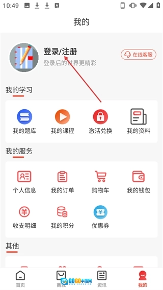 在【我的】页面中,点击【登录/注册】按钮。