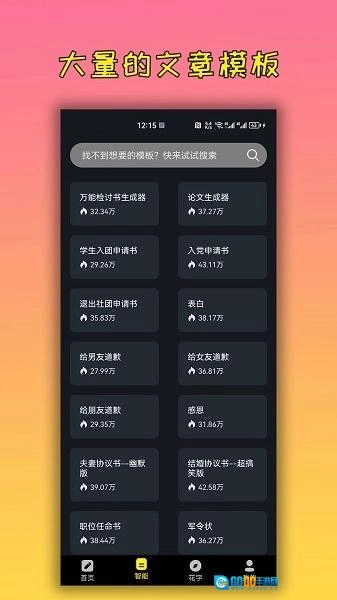 丰富的模板:自我批评信、申请信、论文、小说和其他文章模板。用户可以根据需要进行选择,以快速完成内容创建。
