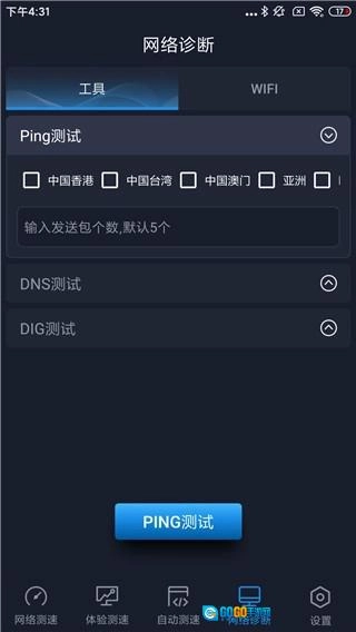 网络诊断功能分为工具和WiFi两个板块,工具部分包含Ping测试、DNS测试与DIG测试三项。其中Ping测试支持从中国到六大洲的链路性能检测,可获取时延和丢包率数据,专业性较强;尽管普通用户日常使用频率较低,但能有效满足特定用户的测试需求。