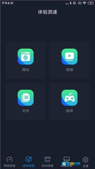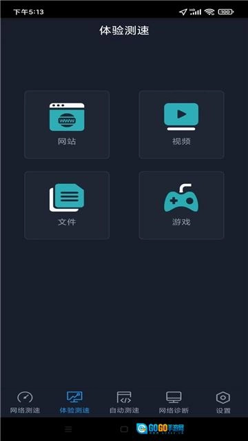 测速功能体验中设有网站、视频、文件、游戏四大板块,用户可依据自身需求选择对应板块开展针对性测速。