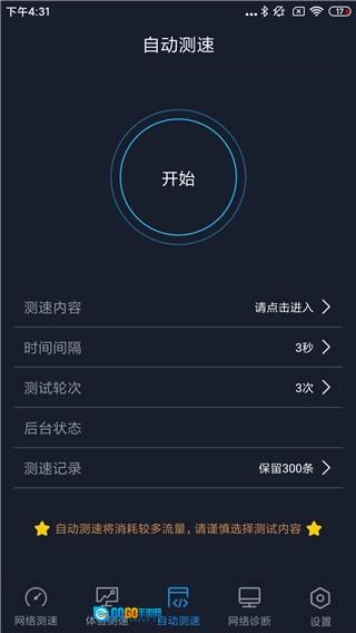 在自动测速功能里,用户能够选择宽带测试、网页测试、视频测试、文件测试以及游戏测试等多个项目,系统后台会提供预计消耗的流量和所需时间的数据。当使用宽带进行测速时,预计消耗流量会显示为0;而若使用移动数据测速,预计消耗流量则会呈现真实的数值。