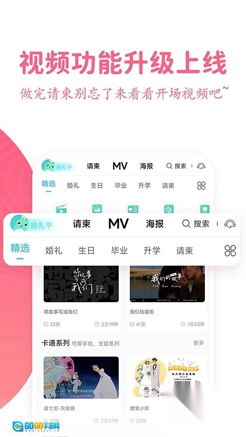 支持上传爱情MV,拍摄花絮,在请帖中自由播放。