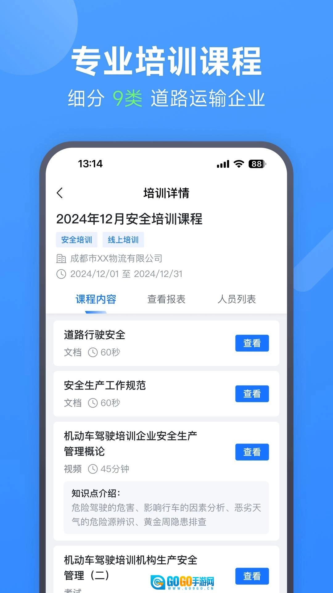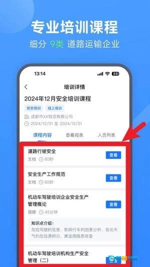 在培训详情页面,选定对应的培训课程后,点击“查看”按钮就能启动学习流程,同时还可以查看学习报告以及参与该培训的人员名单。