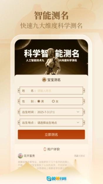 操作体验十分便捷:界面设计简洁明了,操作流程简单易懂,还具备一键生成高分名字、相似名字智能匹配等实用功能,能帮助用户轻松又快速地找到自己喜欢的名字。