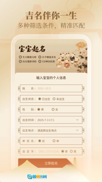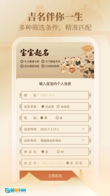 个性化定制服务:可依据用户提供的姓氏、性别、出生日期、五行偏好等信息,打造专属的名字建议,还能按需求指定辈字、从诗词中取意命名等。