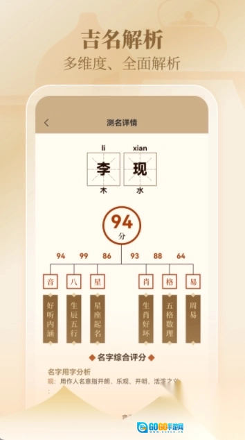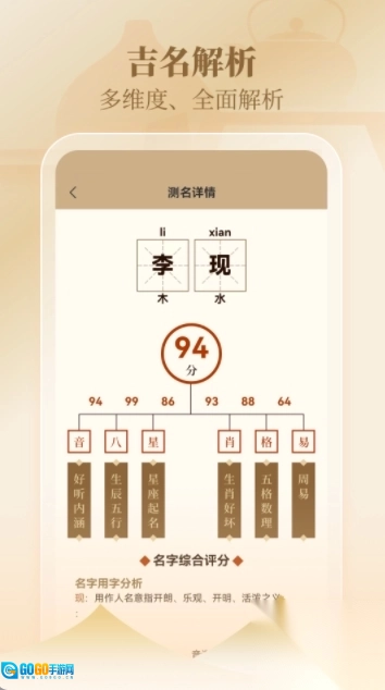 多维度名字解析:除了给出名字的吉凶评分外,还会对名字的来源、含义、音韵、五行特质等方面进行细致解读,助力用户全方位认识名字。