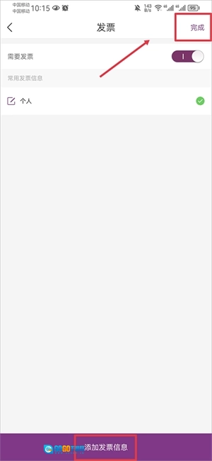如果是个人开票,直接点击右上角的“完成”按钮即可;若是企业开票,则需要点击下方的“添加发票信息”选项。