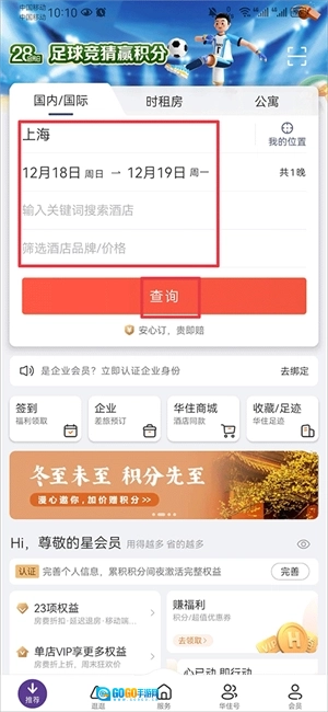 打开后,在推荐页面里选定入住的地址、时间和酒店,接着点击查询按钮。