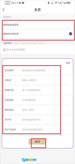 然后选择发票类型,把企业名称、识别号、信用代码、注册地址、联系电话、开户行以及开户行账号这些信息补充完整后,点击保存按钮。