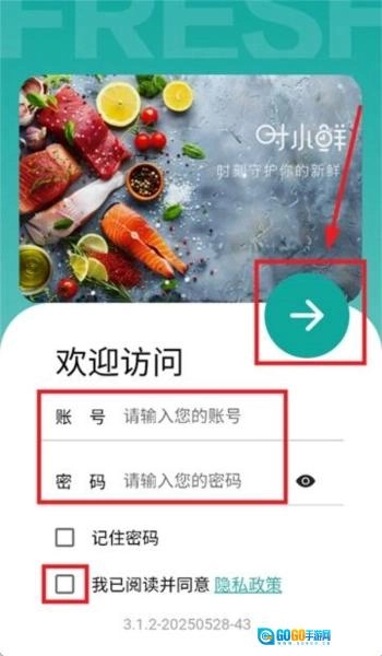进入登录界面后,输入账号和密码,勾选“我已阅读并同意隐私政策”,再点击图中所示的向右箭头,就能完成登录操作。