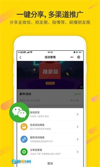 支持快速搭建活动,完成制作后能够一键同步到微信、朋友圈、社群等渠道,无需繁琐的适配或审核步骤,助力用户抓住营销机遇,降低从制作到推广的时间成本。