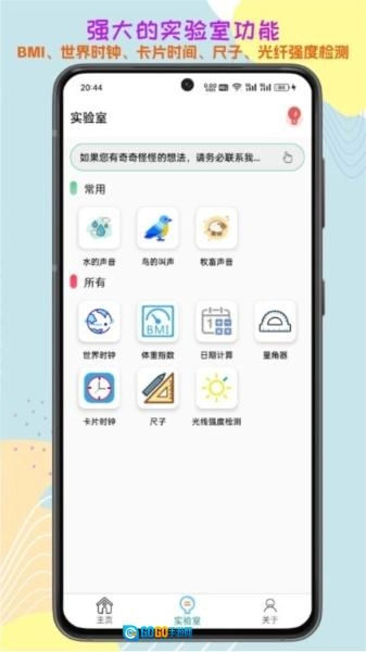 多功能工具: 这款应用的用途十分广泛,除了声音相关功能外,还整合了多种实用工具,包括世界时间查询、体重管理与BMI计算、日期间隔统计、量角器以及尺子等,能为用户的日常生活提供不少便利。