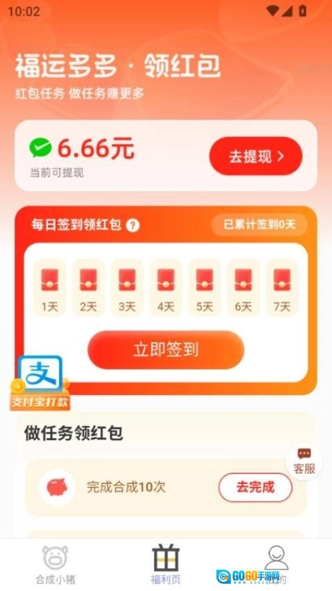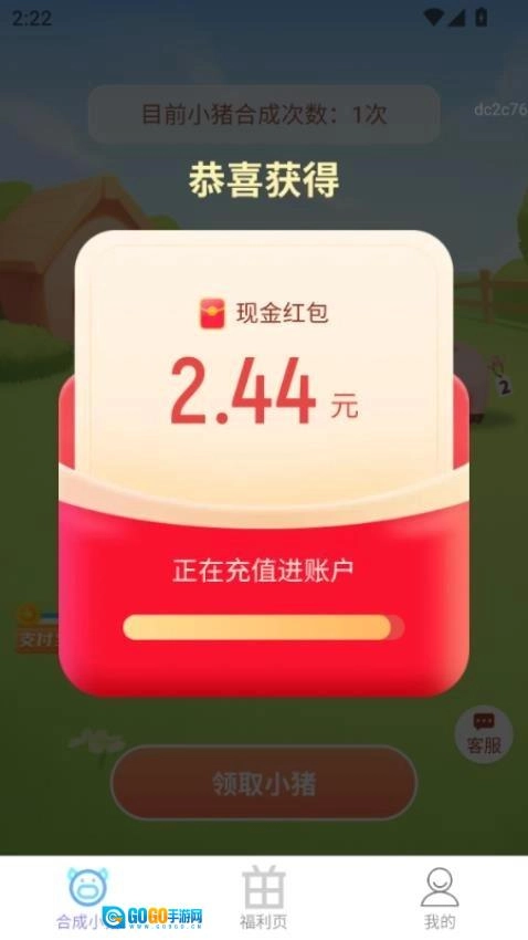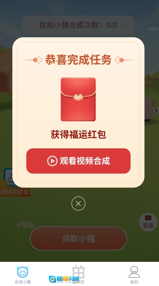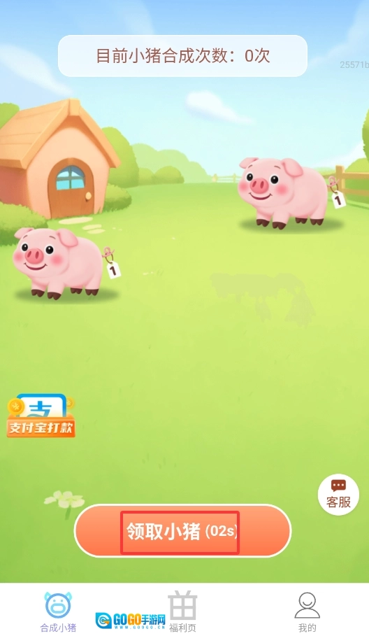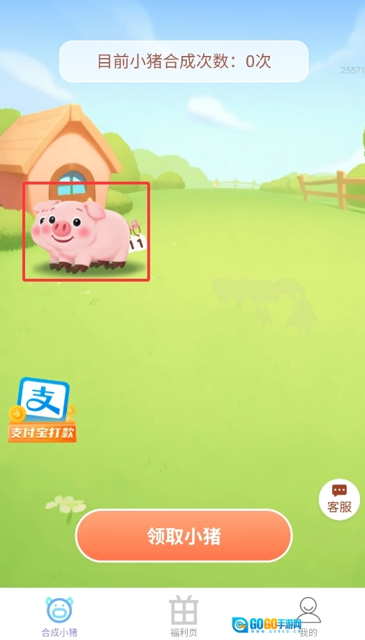 打开福星赚钱宝,进入“合成小猪”游戏界面,点击“领取”按钮就能得到初始小猪。