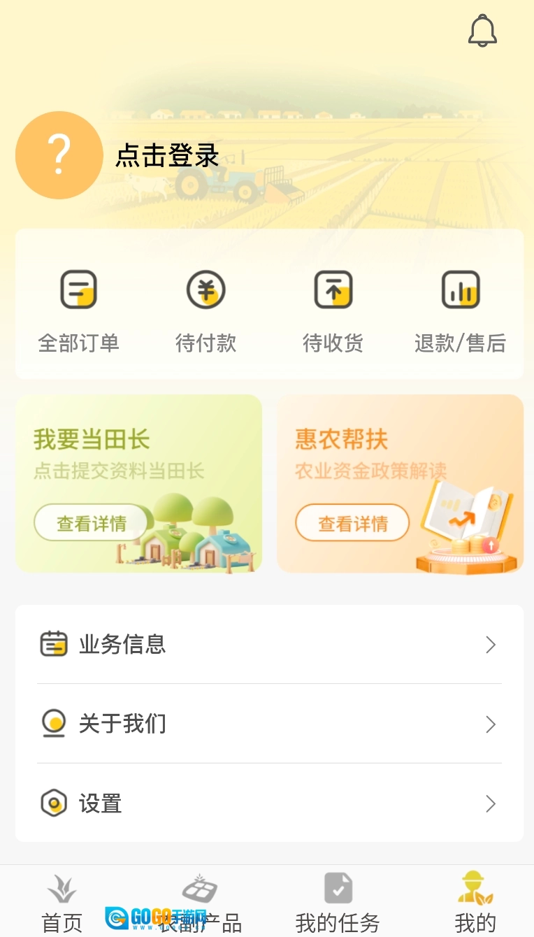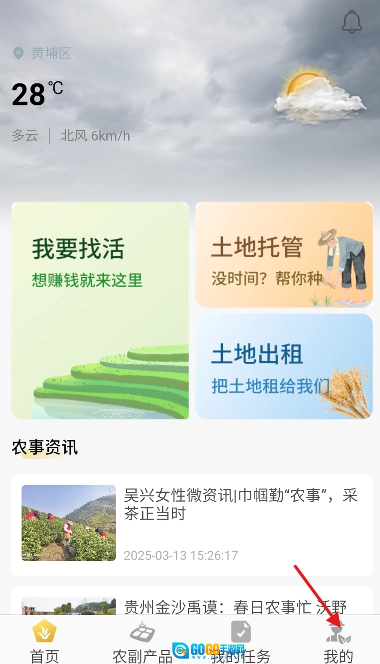 打开金土地智农应用,在首页底部区域找到“我的”选项,点击该选项进入相关页面。