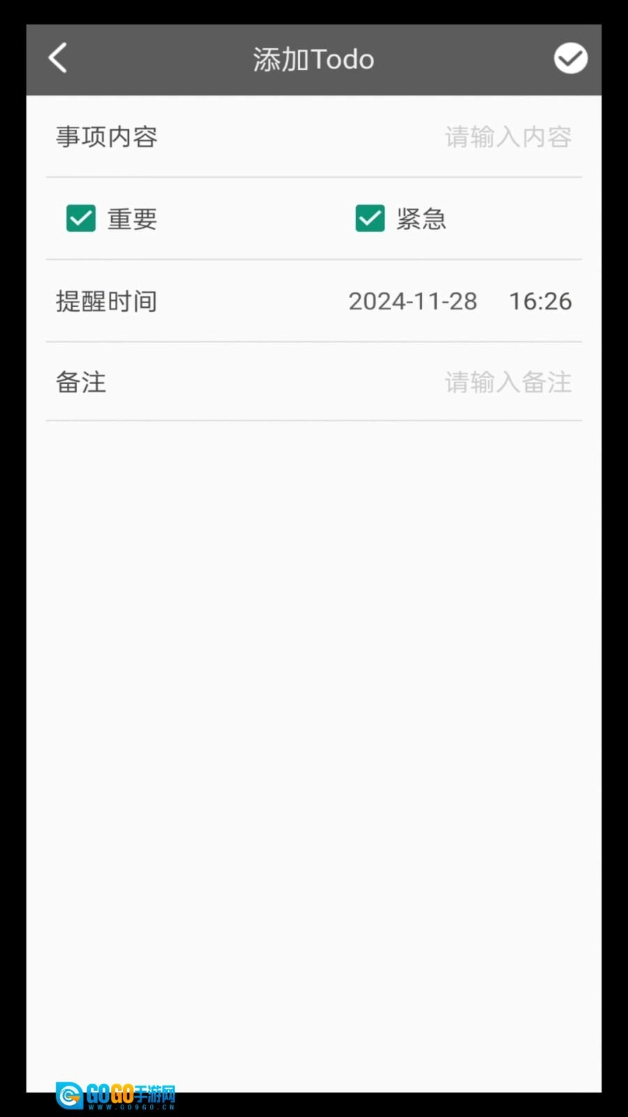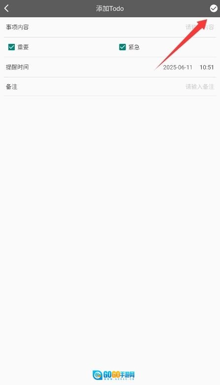 点击右上角的加号添加事件,输入事项内容,设置提醒时间和备注后点击右上角保存即可。