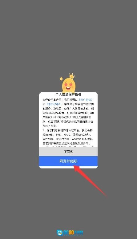 首次使用时,请仔细阅读并同意用户协议与隐私政策,随后点击“同意并继续”按钮,即可进入主界面。
