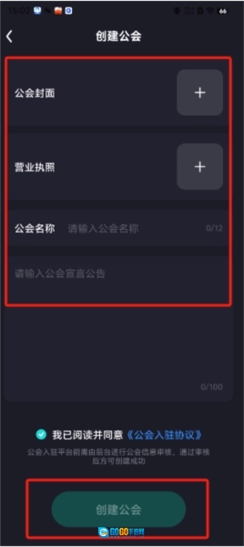 第四步:点击“创建公会”按钮,上传营业执照并填写所需的相关信息,最后再次点击“创建公会”完成操作即可。