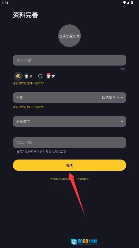 请按要求完善个人资料,包括上传头像、设置昵称和居住城市等信息,同时创建并保存登录密码。