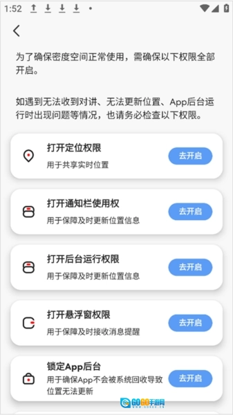 双方完成安装后即可打开应用,进入聊天页面后点击【去开启】按钮,完成相关权限的开启操作。