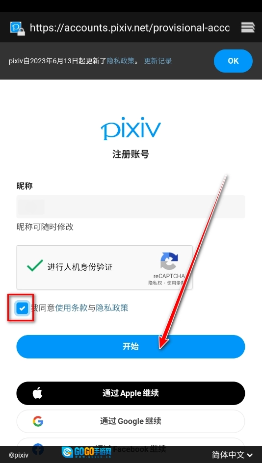 完成后勾选使用条款和隐私政策,点击“开始”按钮,再按照提示完成注册流程。