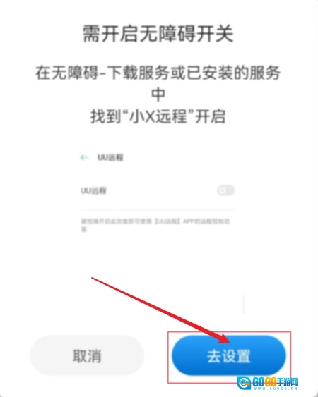 请注意弹窗上的文字说明,点击“去设置”按钮后,找到“小X远程”功能并将其开启就可以了。