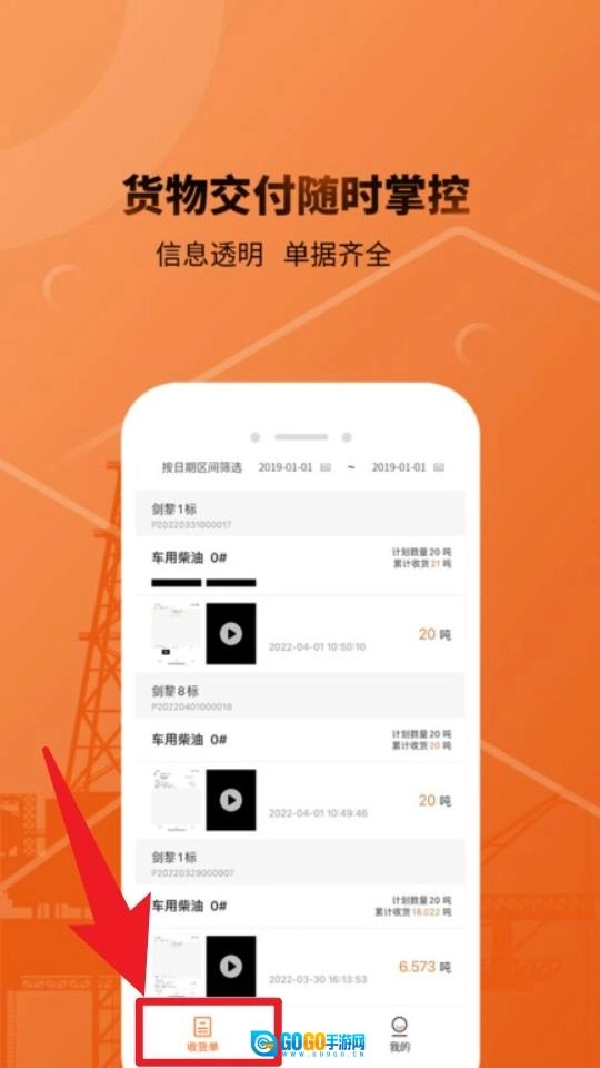 登录成功后进入首页,系统默认显示“收货单”界面,在此可查看每笔油料交付的相关信息,其中包含运输批次以及计量详情等内容。