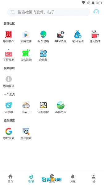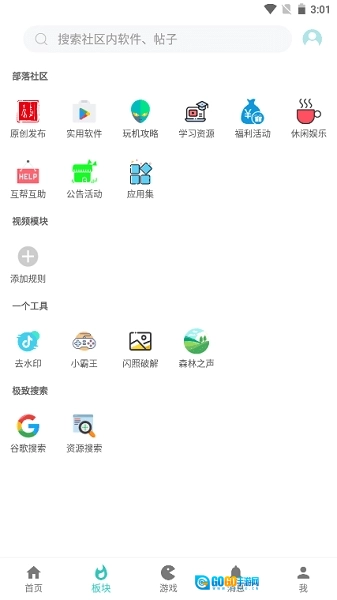 然后点击下方的“版块”,就能看到各类不同的实用工具了。