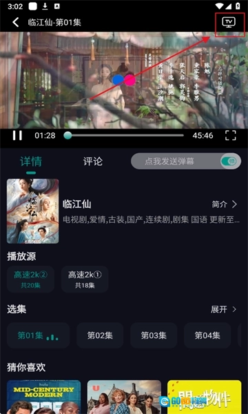一键打开进入播放详情页,点击右上角"tv"标志。
