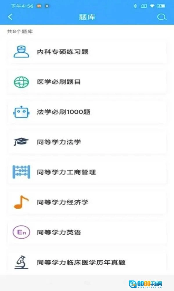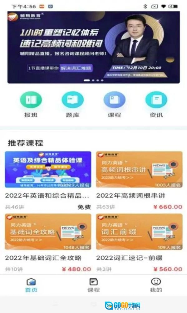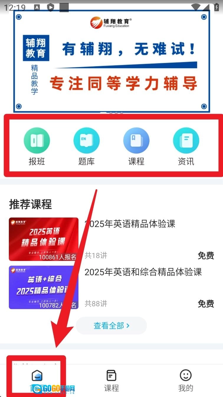 在首页页面点击顶部的功能入口,就能快速进入“报班”“题库”“课程”“资讯”等主要模块。