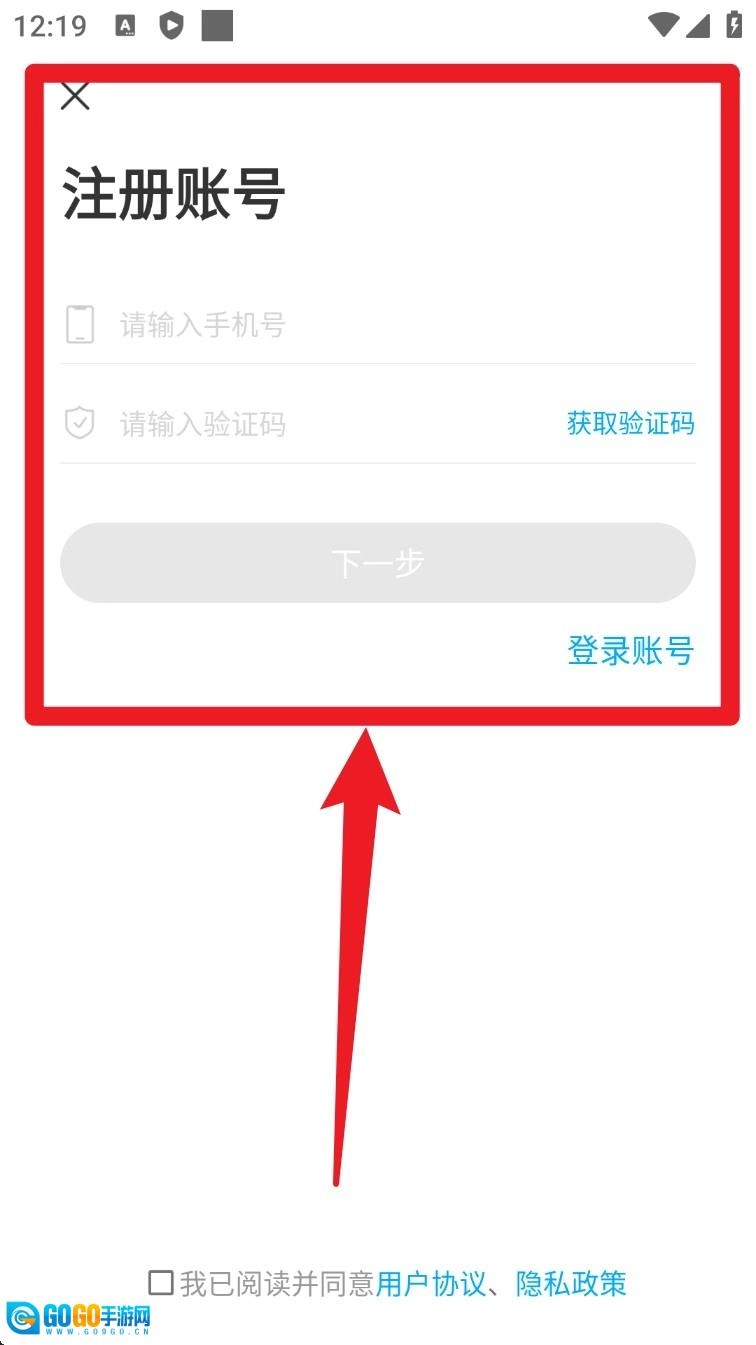 打开应用程序后进入注册界面,输入手机号码和验证码,勾选相关协议并点击「下一步」按钮,即可完成账号注册流程。