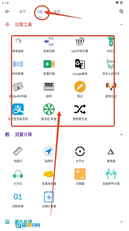 可以一键切换到功能板块,那里有多个工具箱可供选择,只需一键打开就能使用。