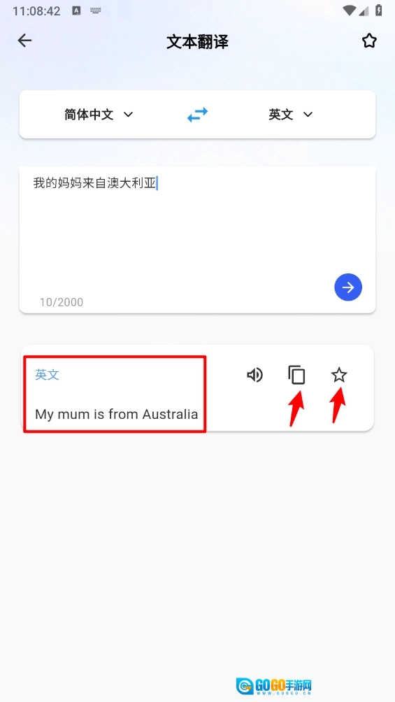 如图所示,点击进入文本翻译界面,输入需要翻译的内容,就能开展翻译操作,并且可以复制和收藏翻译后的内容。