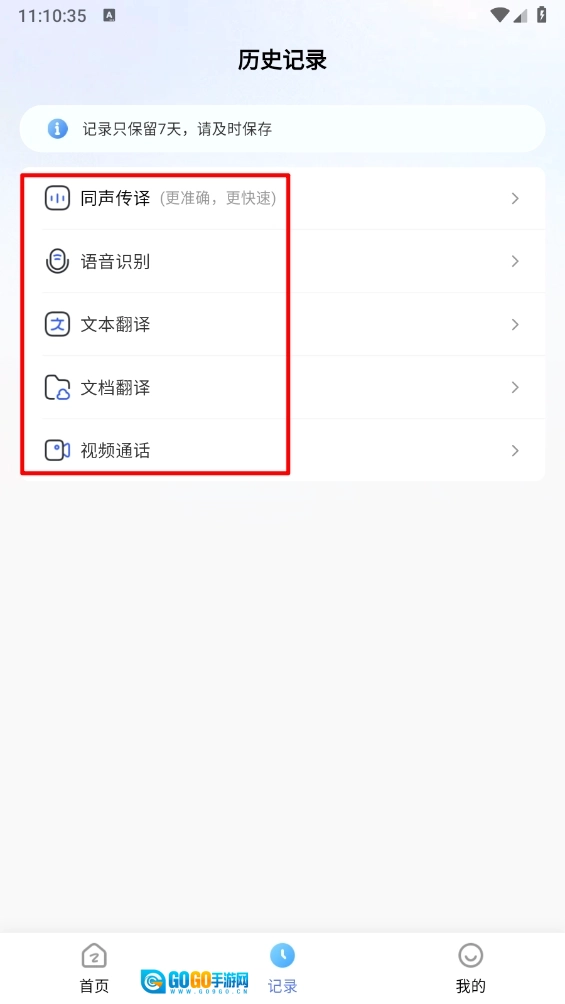 切换到“记录”板块即可查看对应的翻译记录,需要留意的是,这些记录仅保留7天时间。