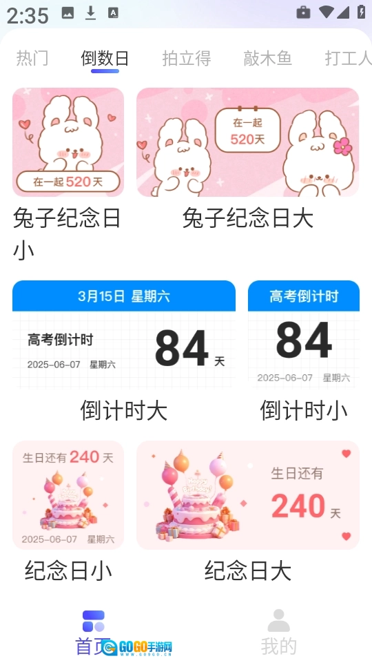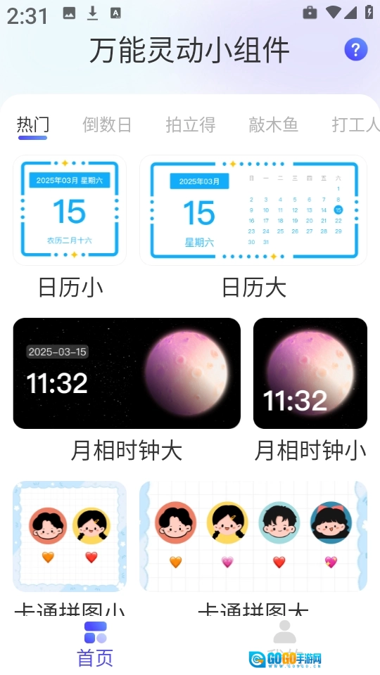 首页提供了倒数日、拍立得、敲木鱼、打工人等多种风格的小组件。