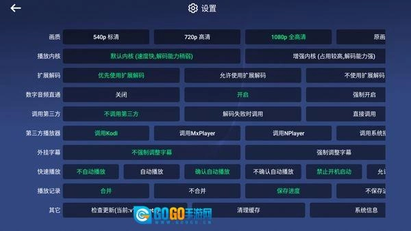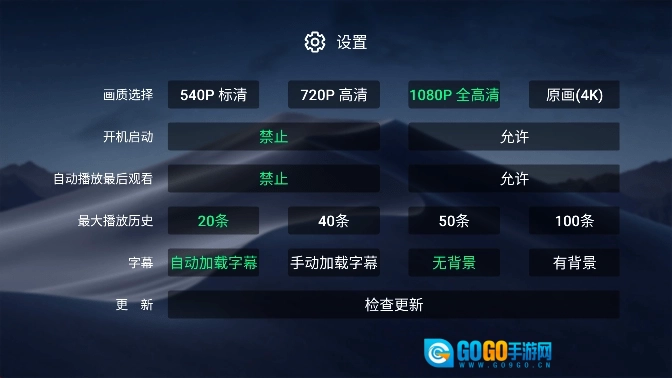 你可以按照自己的需求进入设置页面,对画质进行相应调整,还能设置开启即自启动、自动播放上次最后观看的内容以及自动字幕功能。