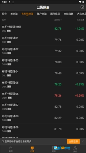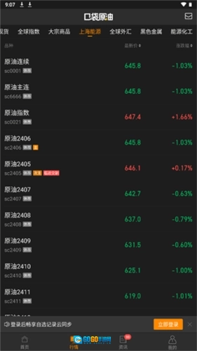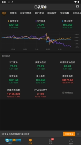 用户打开应用后,在【行情】页面就能查看原油行情,在该页面的综合面板里,还可以同时看到原油、美元和黄金这三者的行情走势以及它们之间的涨跌关联。