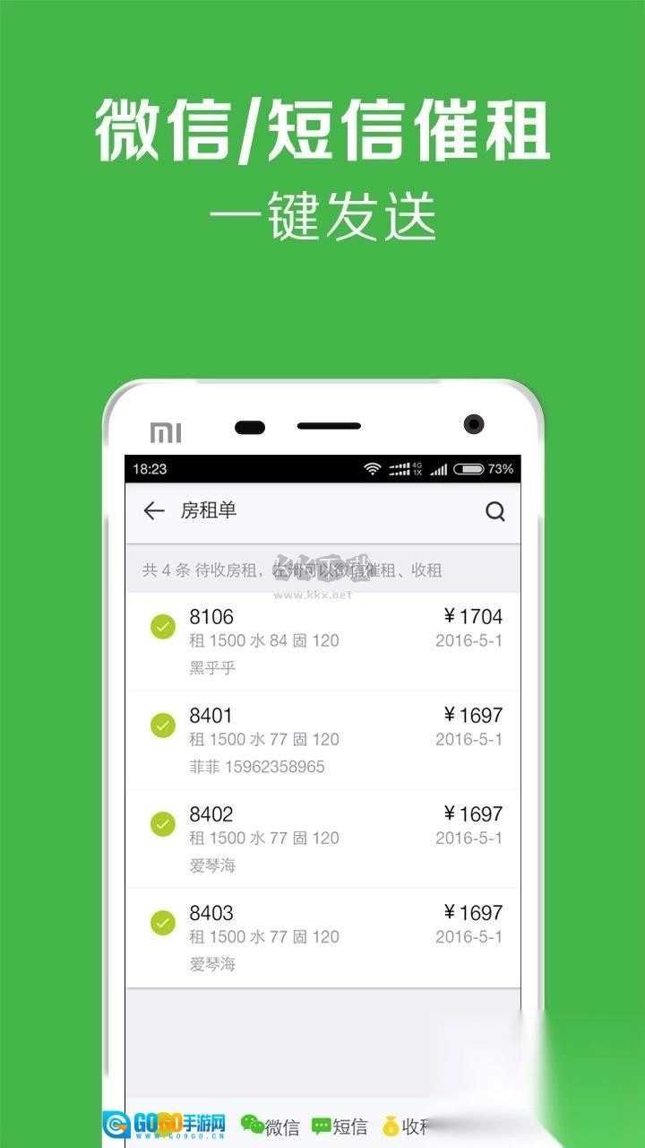 2. 若租客关注并绑定“租房管理”微信公众号,无需添加为好友即可发送房租单,且支持批量群发。【短信催租功能】可借助本机手机短信或系统短信向租客推送房租单短信,并且支持批量发送。