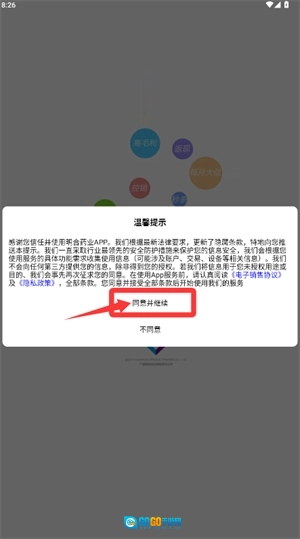 打开应用后,在弹出的提示窗口中选择“同意并继续”以进入下一步操作。