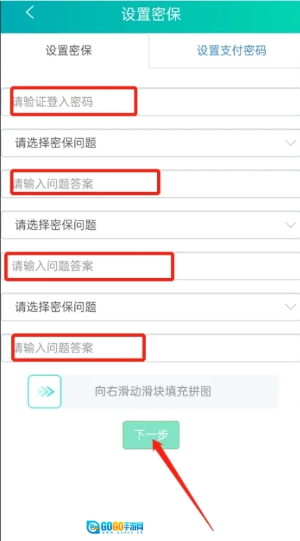 请先输入登录密码,接着设置密保问题与对应的答案,一共要设置三个密保问题,完成后点击“下一步”,这样就完成设置了。