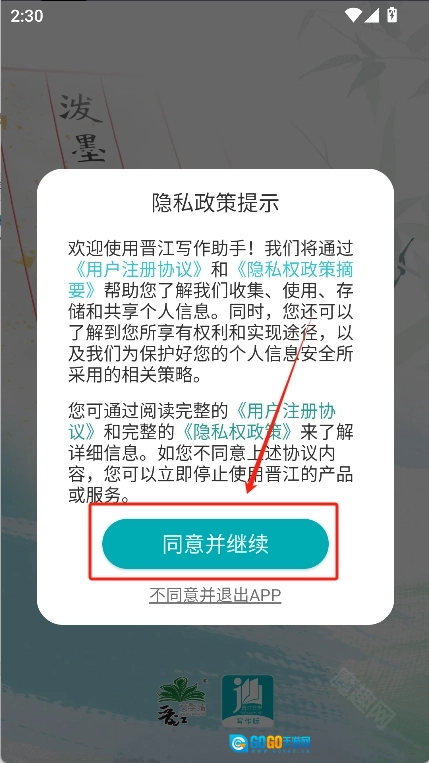 首先前往魔趣网下载并安装晋江写作助手,接着点击“同意并继续”按钮进入软件。