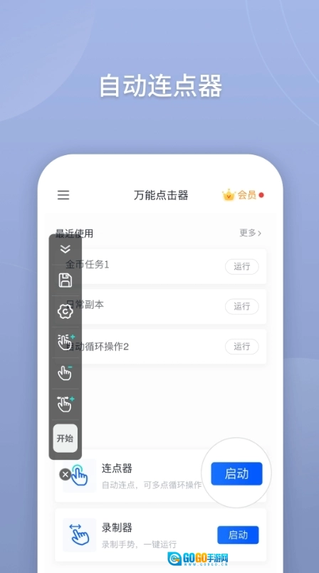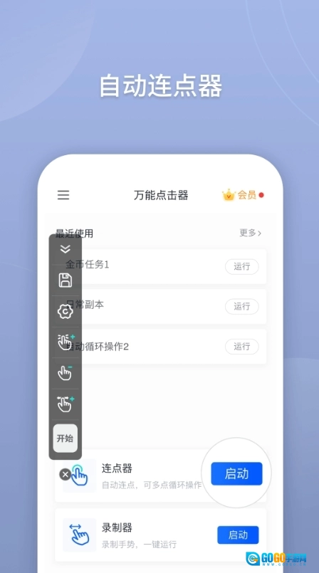 自动点击器借助浮动控制面板来开启或停止自动点击功能。您能够利用该控制面板在屏幕上添加所需的点击位置,从而完成自动点击操作。