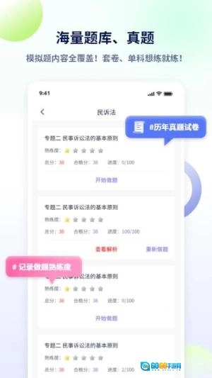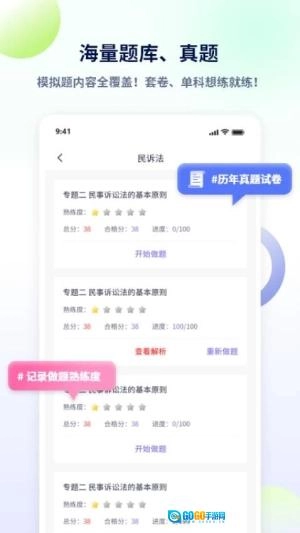 丰富的题库资源,包含历年法考真题和高质量模拟题,用户可以根据自己的需求随时进行练习,帮助巩固法律知识的掌握。