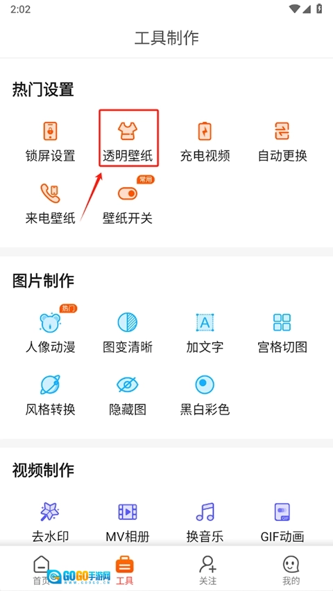 在工具页面选择制作工具,如制作透明壁纸。