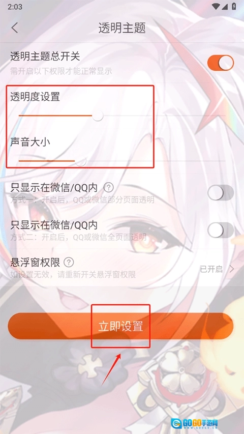 导入完成后,调整壁纸的透明度和声音设置,然后点击“立即设置”按钮。