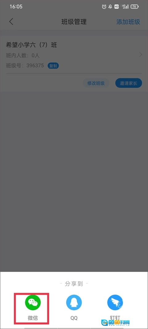 页面下方弹出了微信、QQ、钉钉三种分享选项,选择任一方式发送链接后,家长点击该链接即可进入班级查看自家孩子的学习情况。
