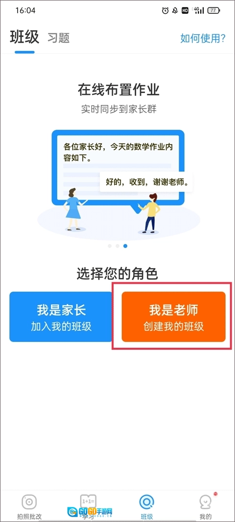 请点击下方菜单栏中的【班级】板块,然后选择对应的角色类型——目前有家长和老师两种选项,这里我们以老师角色为例进行说明。