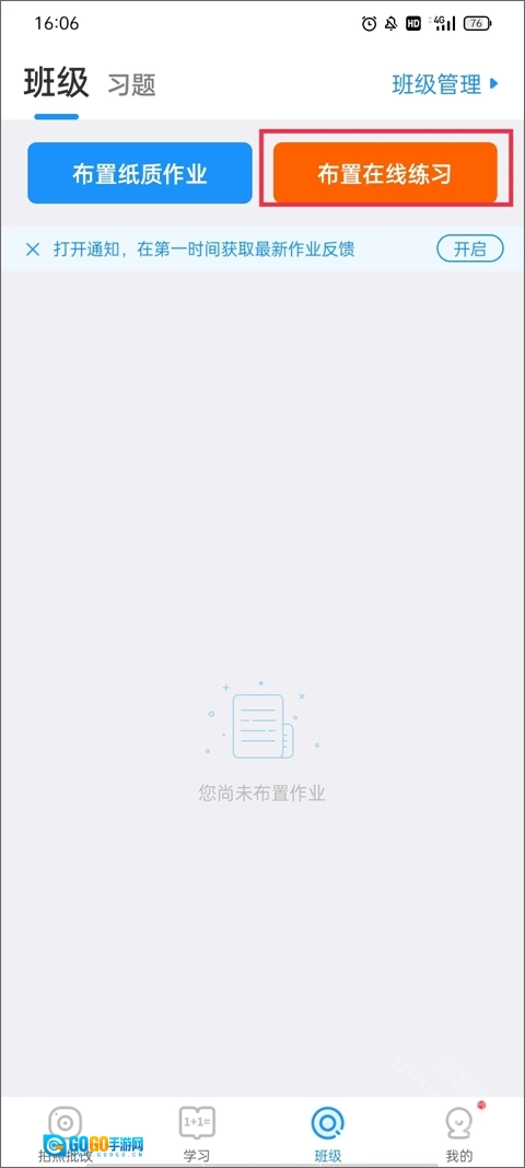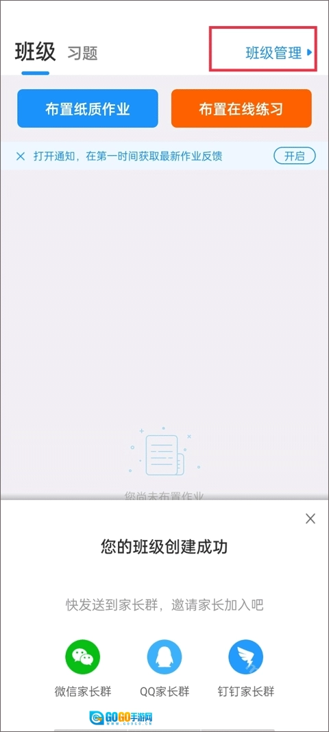 按照提示把班级创建完成后,界面上会呈现出两个功能选项:一是布置纸质作业,二是布置在线练习,此时点击右上角的“班级管理”按钮即可。