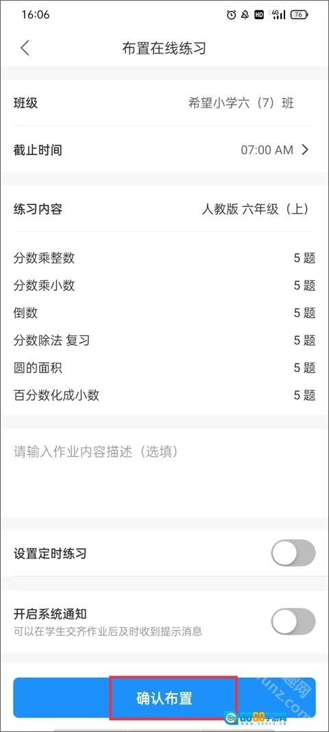确定好要布置在线练习的班级、练习截止时间以及具体练习内容等信息后,点击确认布置按钮即可完成操作。此外,你还能依据实际情况设置定时练习。